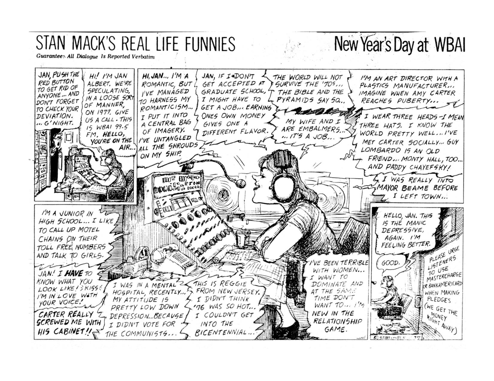 Stan Mack's "New Year's Day at WBAI" comic featuring Jan Albert, from Stan Mack's Real Life Funnies