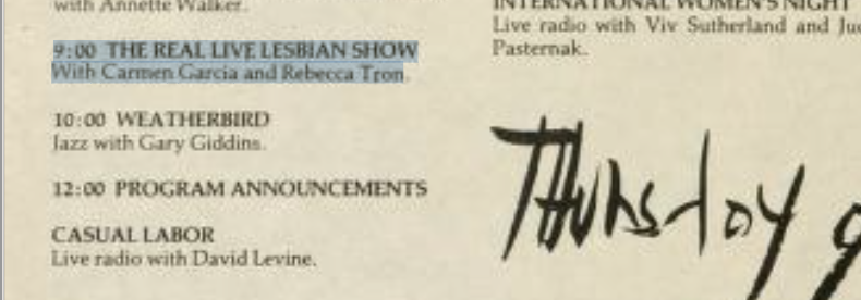“The Real Live Lesbian Show,” Lesbian Herstory Archives AudioVisual Collections, accessed December 15, 2025, https://www.herstories.prattinfoschool.nyc/omeka/items/show/1523.